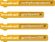 To set the brightness, use the broadcast command: gpio[#]pwm[value] -- [#] indicates the GPIO pin, [value] indicates the duty cycle of the PWM signal ranging from 0 to 255. These three blocks set pin 5 off, half brightness, and then full brightness.