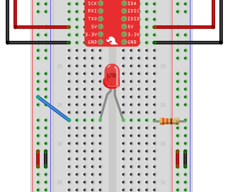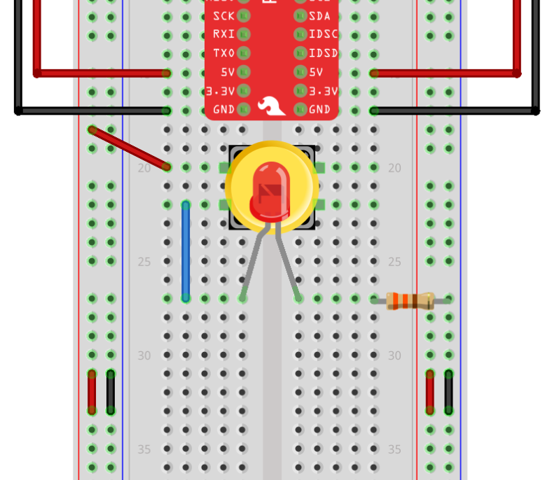 Note: the power rails on the full-size breadboards are often split between the upper half and the lower half. You may need to add a jumper for power and ground to make sure that the power rails are connected throughout the board.