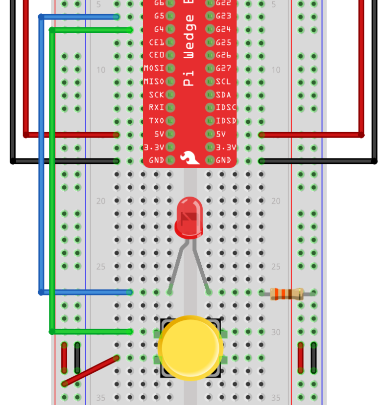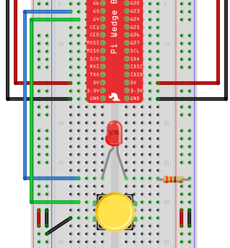 Connecting an External LED to the GPIO pins To control the LED in code, we need to connect it to one of the GPIO pins. The Raspberry Pi can control whether or not these pins have power (high / low / on / off). Connect up an LED to GPIO pin G5 on the Pi Wedge. Now you can turn the LED on and off using a broadcast message: gpio4on or gpio4off. |