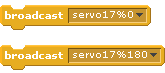 This feature is still a little buggy, but you can control a servo motor by broadcasting the message: servo[#]%[angle] -- [#] indicates the GPIO pin, [angle] indicates the desired rotation angle from 0 to 180. In my most recent tests, it only moves about 45 degrees rather than the full 180.