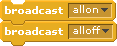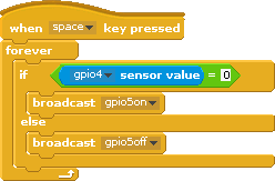 This initializes the GPIO server application that listens to broadcasts and updates variables in Scratch. Broadcast message: gpioserveron. |