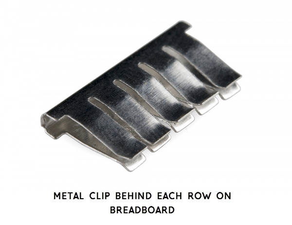 The breadboard is split in half, divided by a ditch - left and right. The left side is completely separate from the right side. The breadboard consists of a bunch of holes where you can insert a wire or a component. The center part of the breadboard is organized into rows of five holes each. Behind each of these rows is a single metal clip that will connect together any wires that are inserted into this row. On the sides of the breadboard are two vertical columns (sometimes marked with a + and a -). These are called power rails. The vertical columns are connected vertically. We often connect Power and Ground to these two columns to provide access to power for building your circuit. These are similar to a power strip you might use in your house.