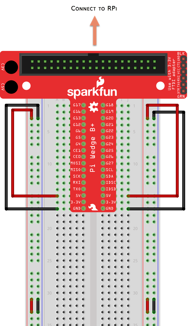 The Pi Wedge will occupy the top 17 rows of a breadboard. Carefully insert the Pi Wedge into the top-most rows of the breadboard. Because you'll probably use these, connect the 5V and GND to the power rails on the breadboard.