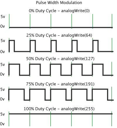 We've shown you how to turn LEDs on and off with a few simple commands. You can also set the LEDs to a half brightness or mid-level brightness using a technique called PWM (pulse-width-modulation). The Raspberry Pi is a digital device. It's only capable of turning pins ON and OFF, but it can also do this really, really fast. It can turn an LED on and off so fast you don't see it blink. The Raspberry Pi flashes the pin at 800 Hz - that's 800 times per second! By changing the duty cycle (the amount of time the pulse is on compared to the amount of time the pulse is off), makes the LED look either brighter or dimmer. The image to the right illustrates how this works.