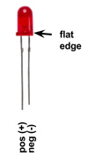 An LED is a special component that lights up when electricity is passed through it. An LED, however, only works when electricity flows in a certain direction. It as what we call a polarity. There are two legs - one is longer than the other. The shorter leg (cathode) is negative. And, if you look carefully at the plastic part, you'll notice a flat edge on this side. The longer leg is called the anode and is positive.