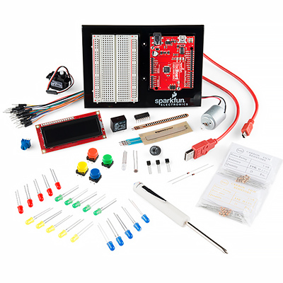 The gold standard for teaching Arduino, the SparkFun Inventor’s Kit (SIK) walks students through basic wiring and coding using breadboard-friendly components. The SIK covers foundational electronics concepts such as polarity, series and parallel circuits, Ohm’s Law, analog vs. digital, and binary number system. The SIK is divided into five major projects, encompassing 16 circuits, that progress in difficulty as new concepts and components are introduced.