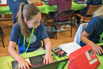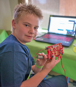 “Parents had been asking for courses that allowed students to take apart clocks, radios and other electronics to learn how they work on the inside,” Meier says. “We wanted something that students could explore in a safe and educational format. We started with one course using the SparkFun Inventor’s Kit [SIK] v3.3, and it was so popular that we now run multiple courses: we use the SIK for Photon for our 13- to 17-year-olds, the Digital Sandbox for the 10- to 12-year-olds and the LilyPad Arduino for our 10- to 15-year-olds at Alexa Café.”